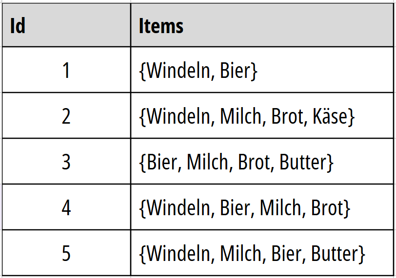 Die Schritte zur Bestimmung der häufigen Item-Mengen anhand dieses Beispiels mit dem Apriori-Algorithmus sind im folgenden aufgelistet.