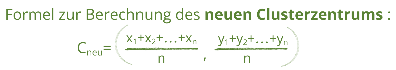 Berechne nun die Koordinaten der beiden neuen Clusterzentren, basierend auf dieser Zuordnung und verändere entsprechend die Positionen der alten Zentren im Koordinatensystem.