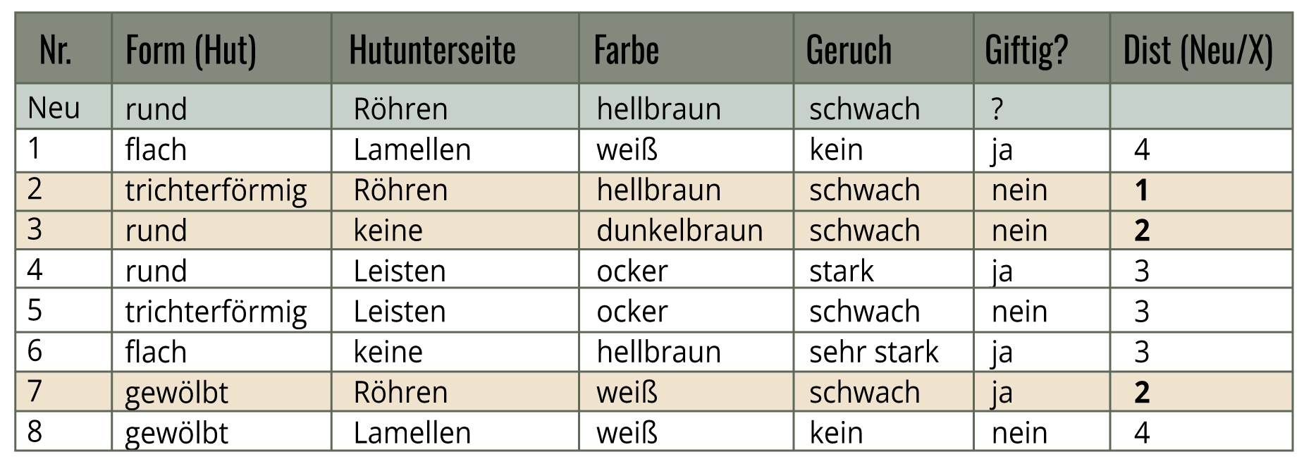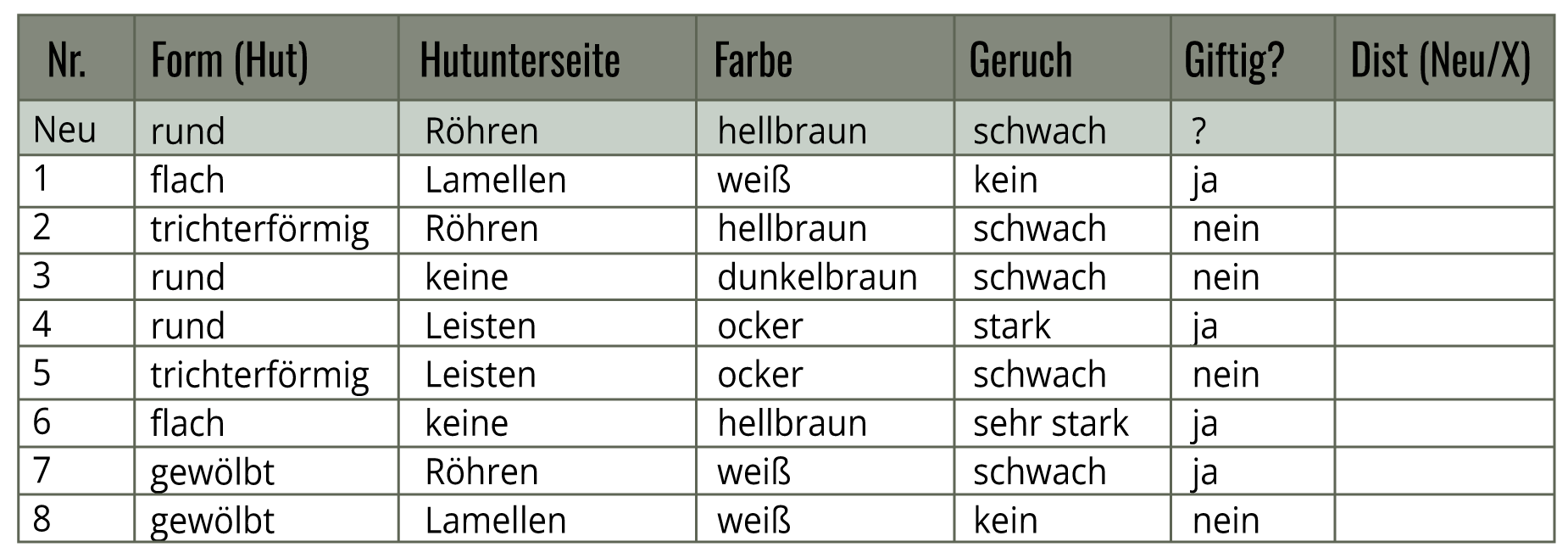 Zur Klassifizierung von Pilzen als giftig oder ungiftig sind die folgenden Datensätze gegeben. Ein neuer Pilzdatensatz soll eingeordnet werden. Berechne dazu zuerst die Distanz zwischen dem neuen Datensatz und jedem der vorhandenen Datensätze. Trage die berechneten Distanzen anschließend in die letzte Spalte der Tabelle ein.