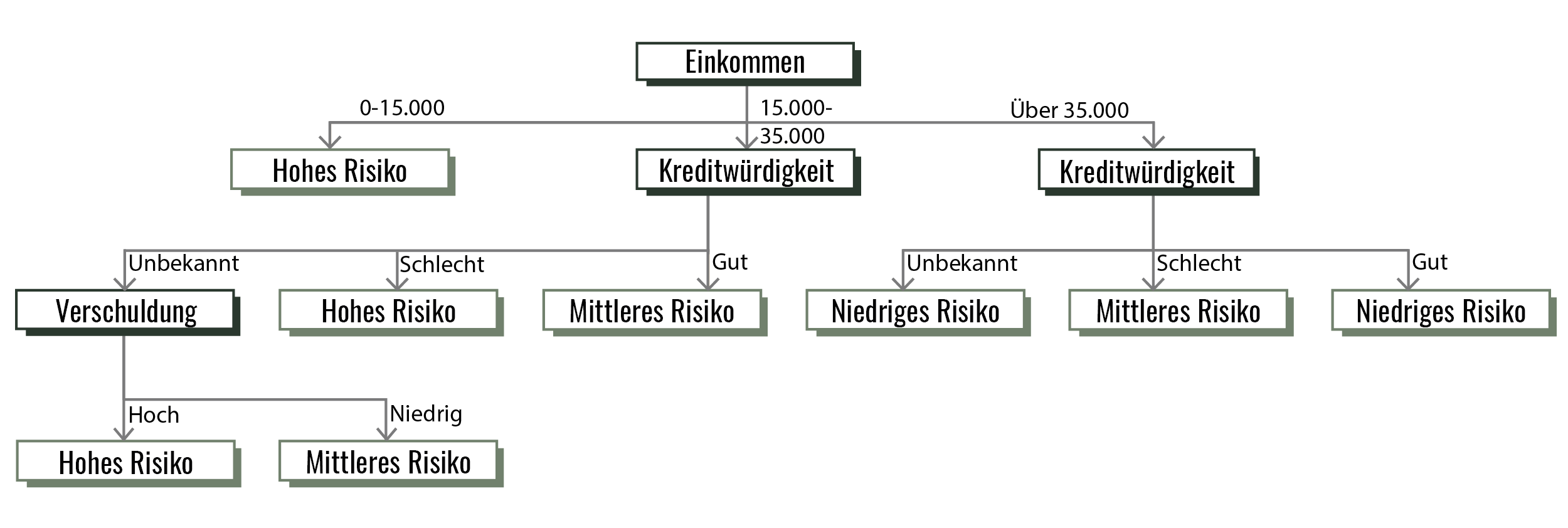 Der folgende Entscheidungsbaum dient der Ermittlung des Kreditrisikos von Kunden anhand der Attribute Einkommen, Kreditwürdigkeit und Verschuldung. Welches Risiko gilt für die Kunden? Bill, Clara und Dieter?
